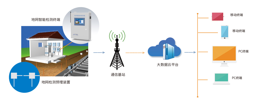 地网智能检测系统由地网检测预埋装置、地网智能检测终端和防雷大数据云平台三部分组成。
